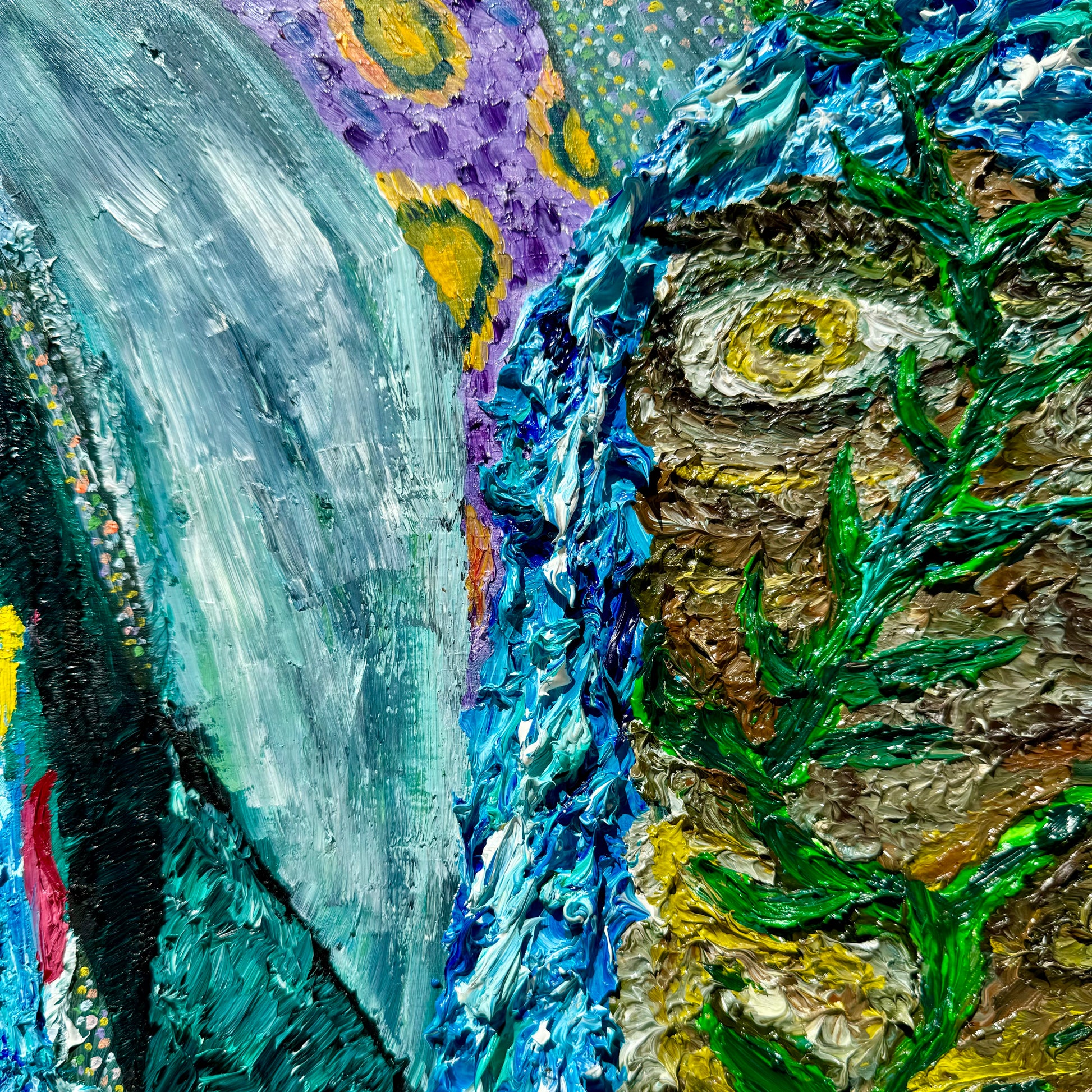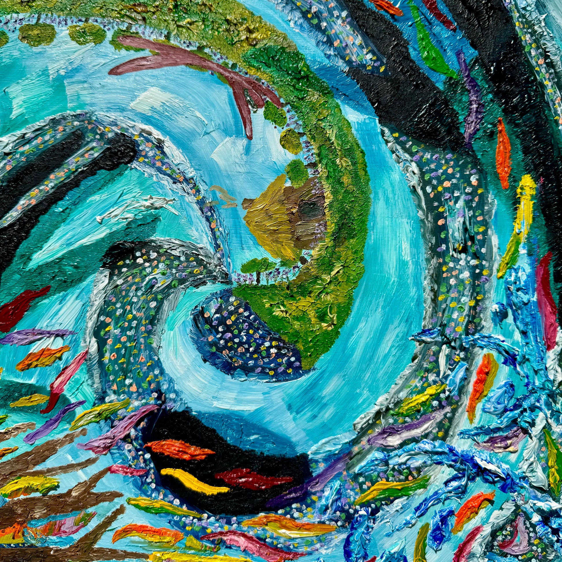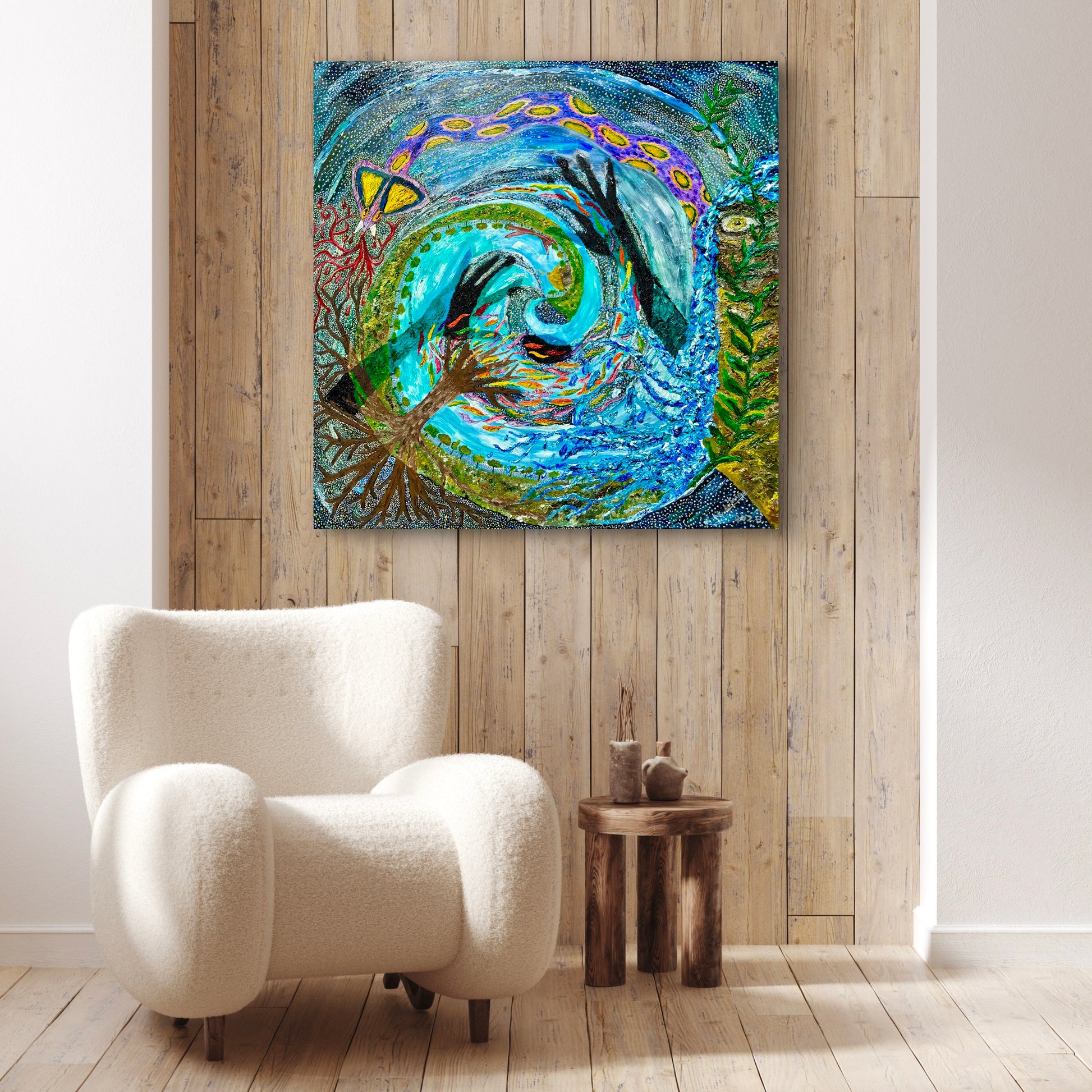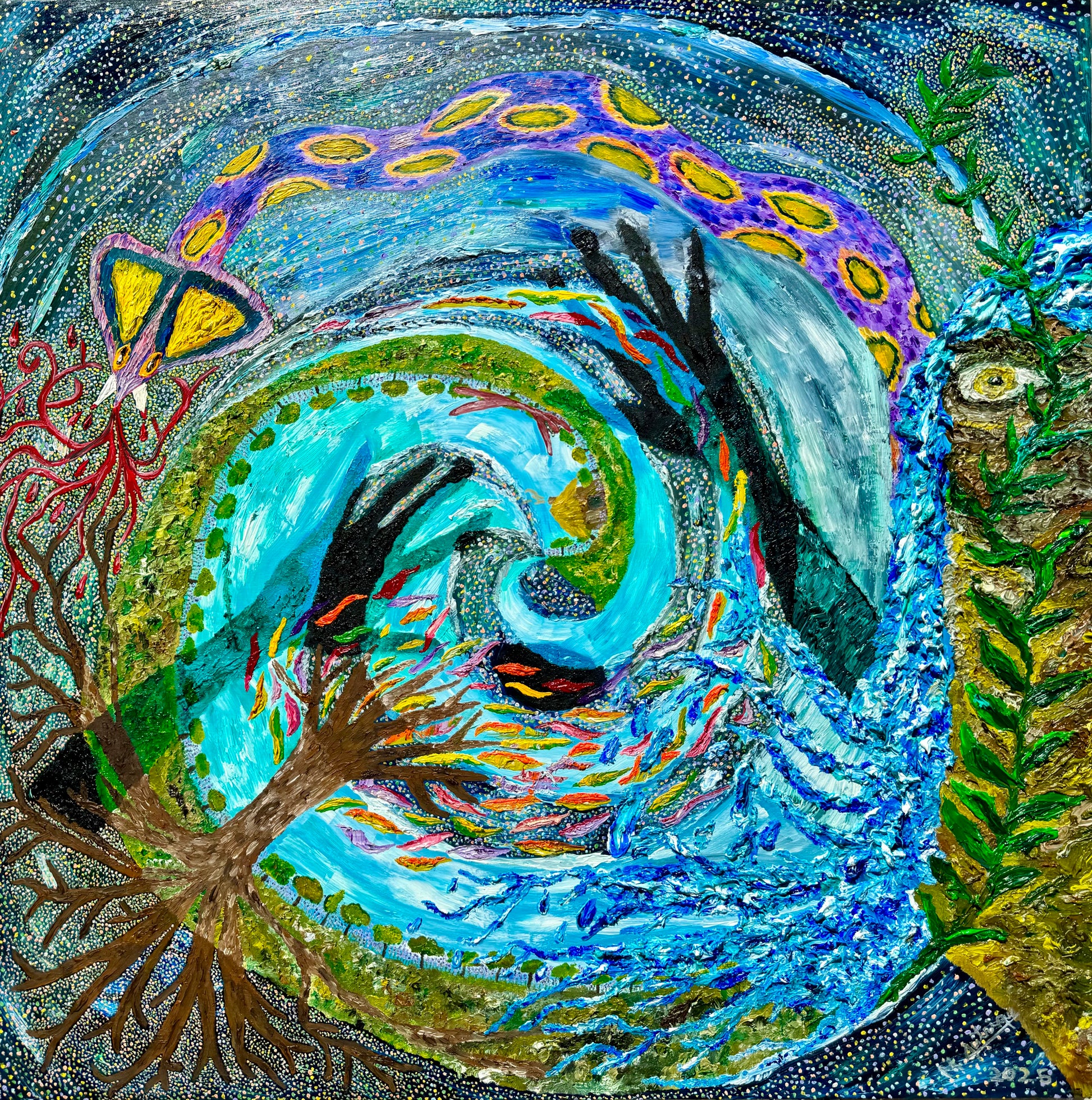 Con esta obra comparto mi lugar seguro. Un rincón dentro del universo (y dentro de mí) construido solo para mí, donde el tiempo y la materia se disuelven, donde encuentro paz y protección. Aquí nadie puede tocarme, nadie puede alcanzarme. Sólo yo habito este espacio, donde la galaxia me envuelve, la naturaleza me protege y el agua me purifica. Es mi refugio, mi escape, mi hogar dentro de mí misma. Mi hogar más allá del tiempo. Es aquí dentro de mí, resguardada en mi cosmos interior, donde puedo transformarme, renacer y florecer.