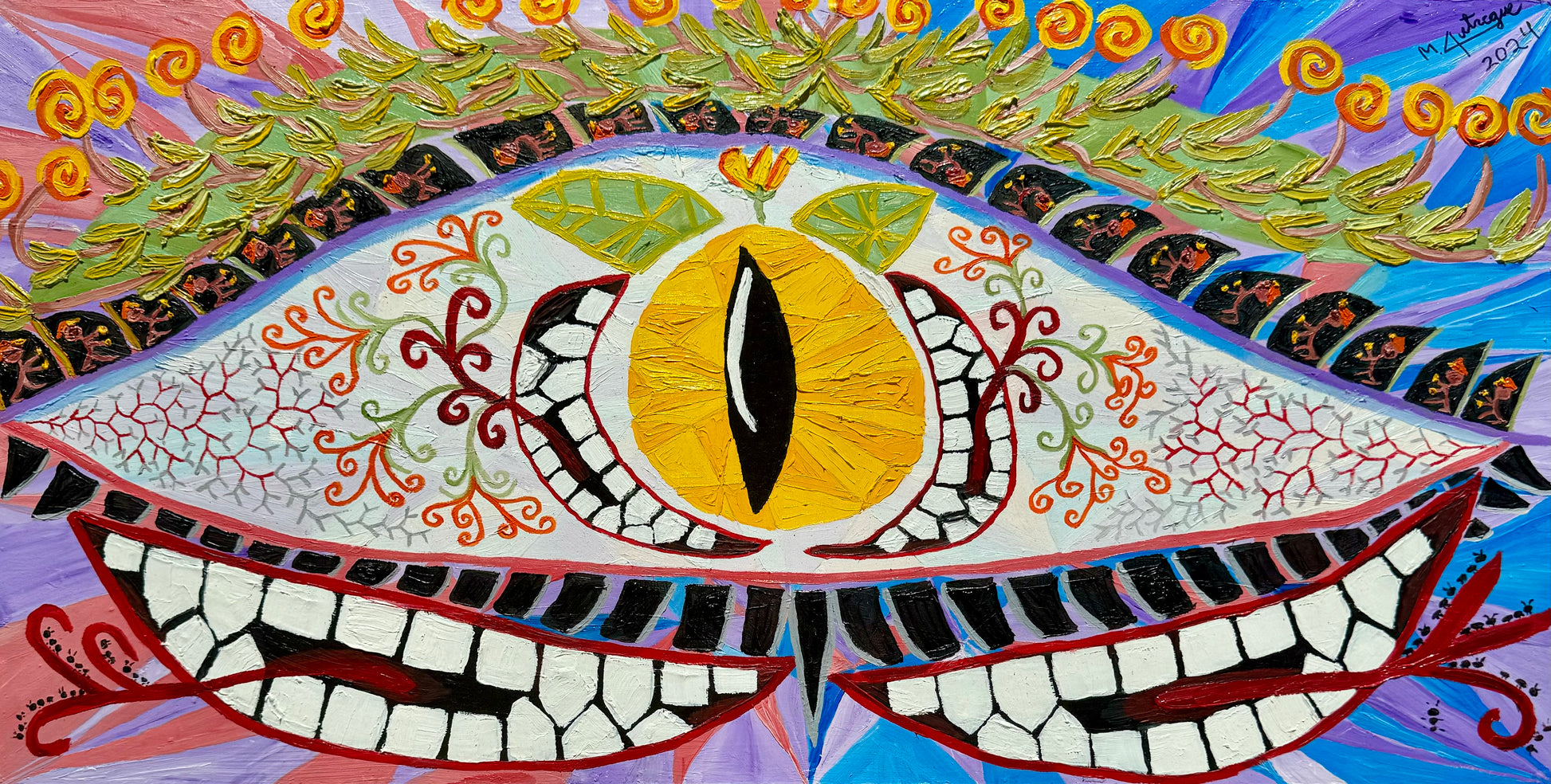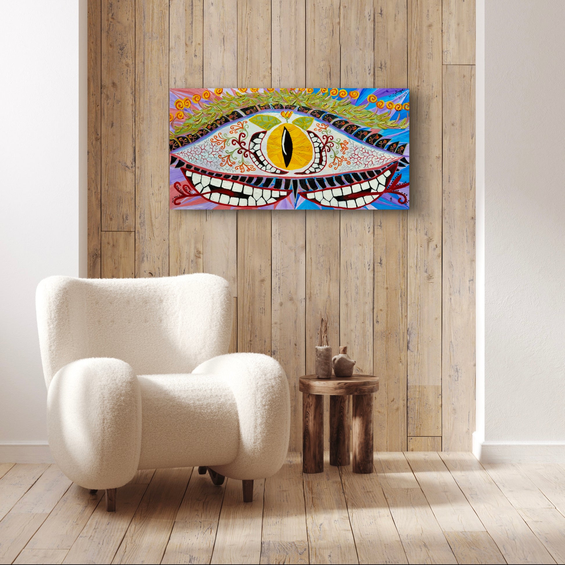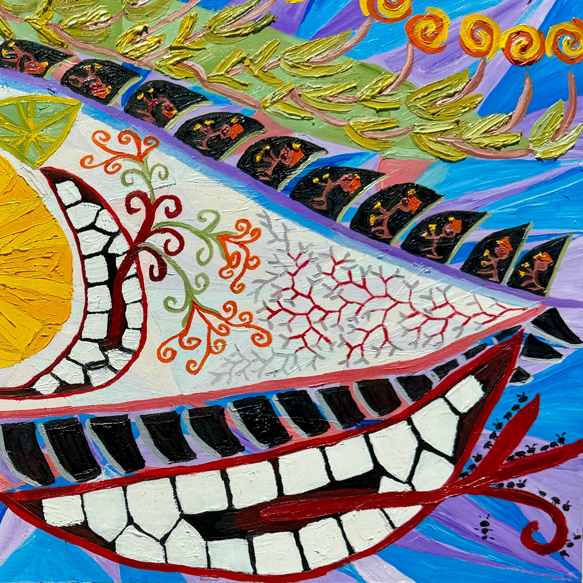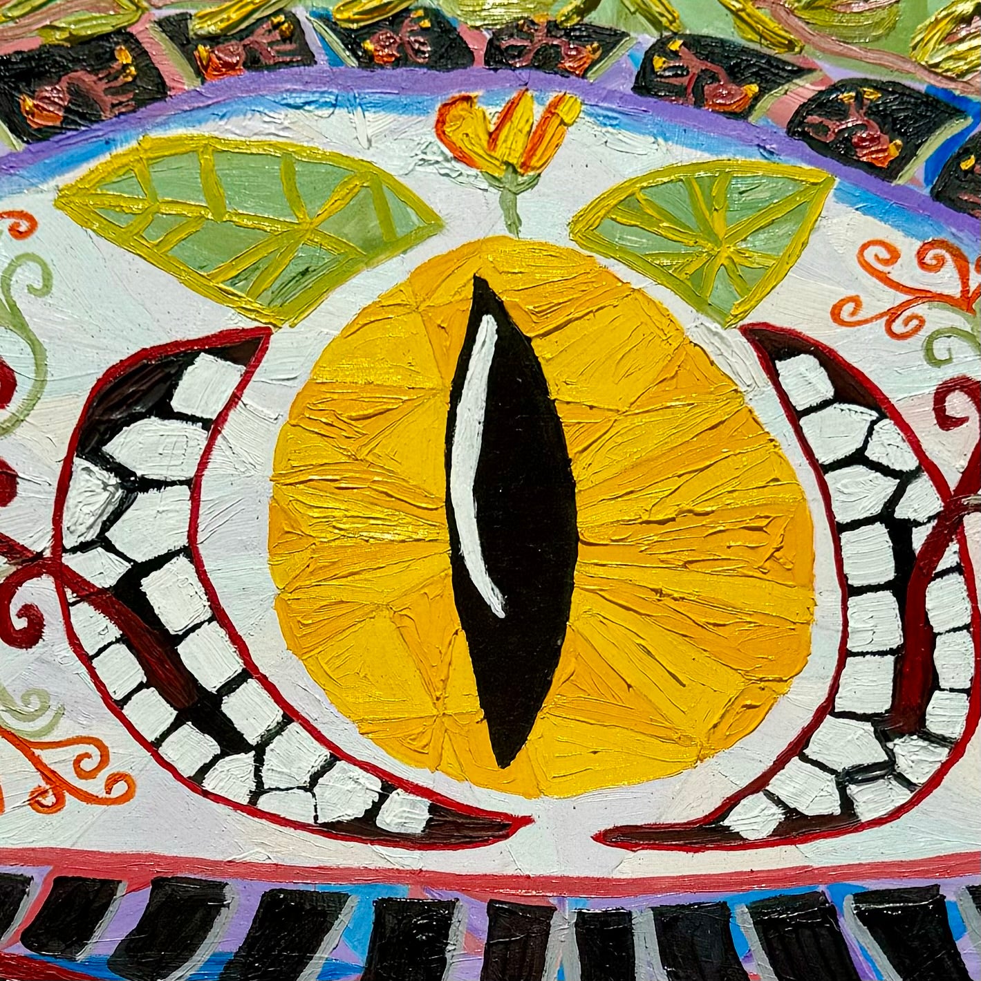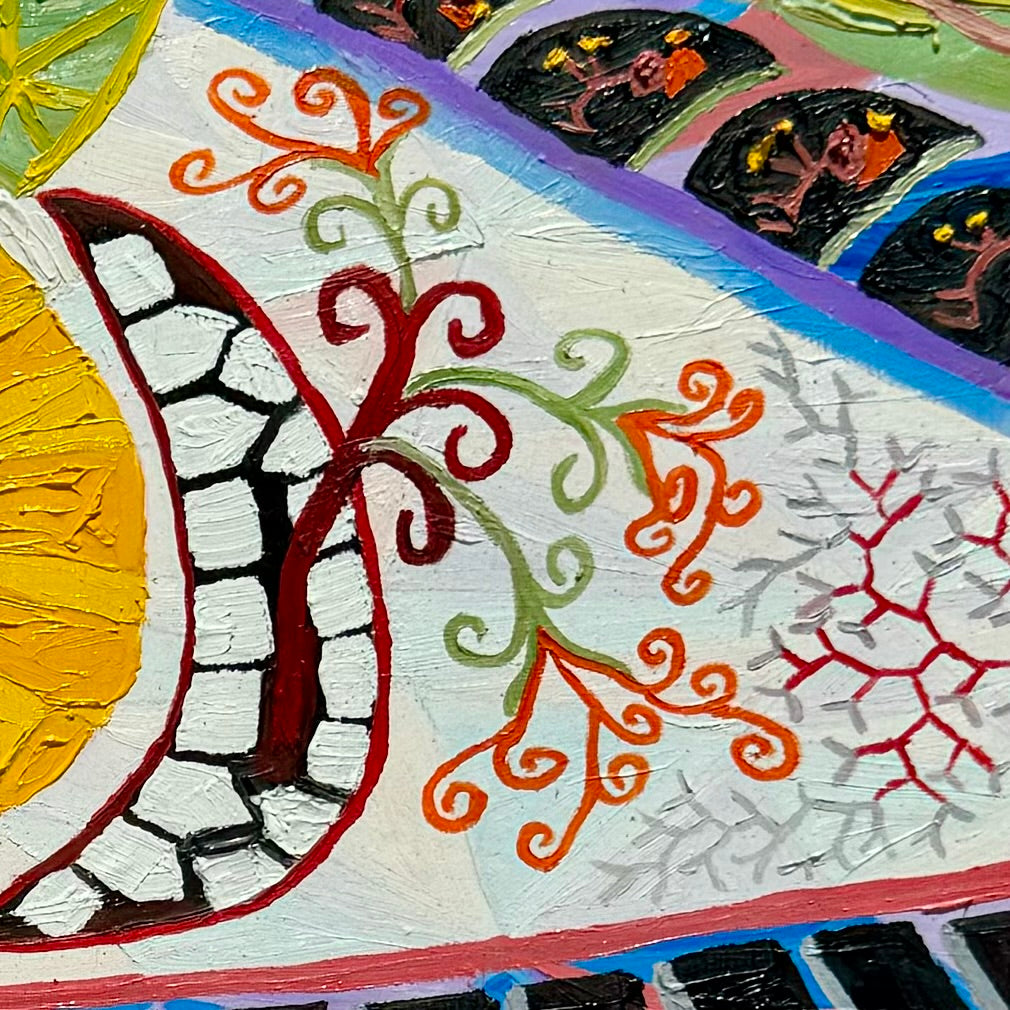 Esta es la primer obra que pinté después de mudarme de ciudad. Fue muy complicado pintar sin mi caballete, fuera de mi estudio y en un tamaño más pequeño al que no estaba acostumbrada. Quise tirar la obra mil veces porque no me estaba gustando pero me recordé a mí misma que siempre paso por eso y que sólo es una etapa, que el resultado final me encanta. Afortunadamente volvió a ser el caso.