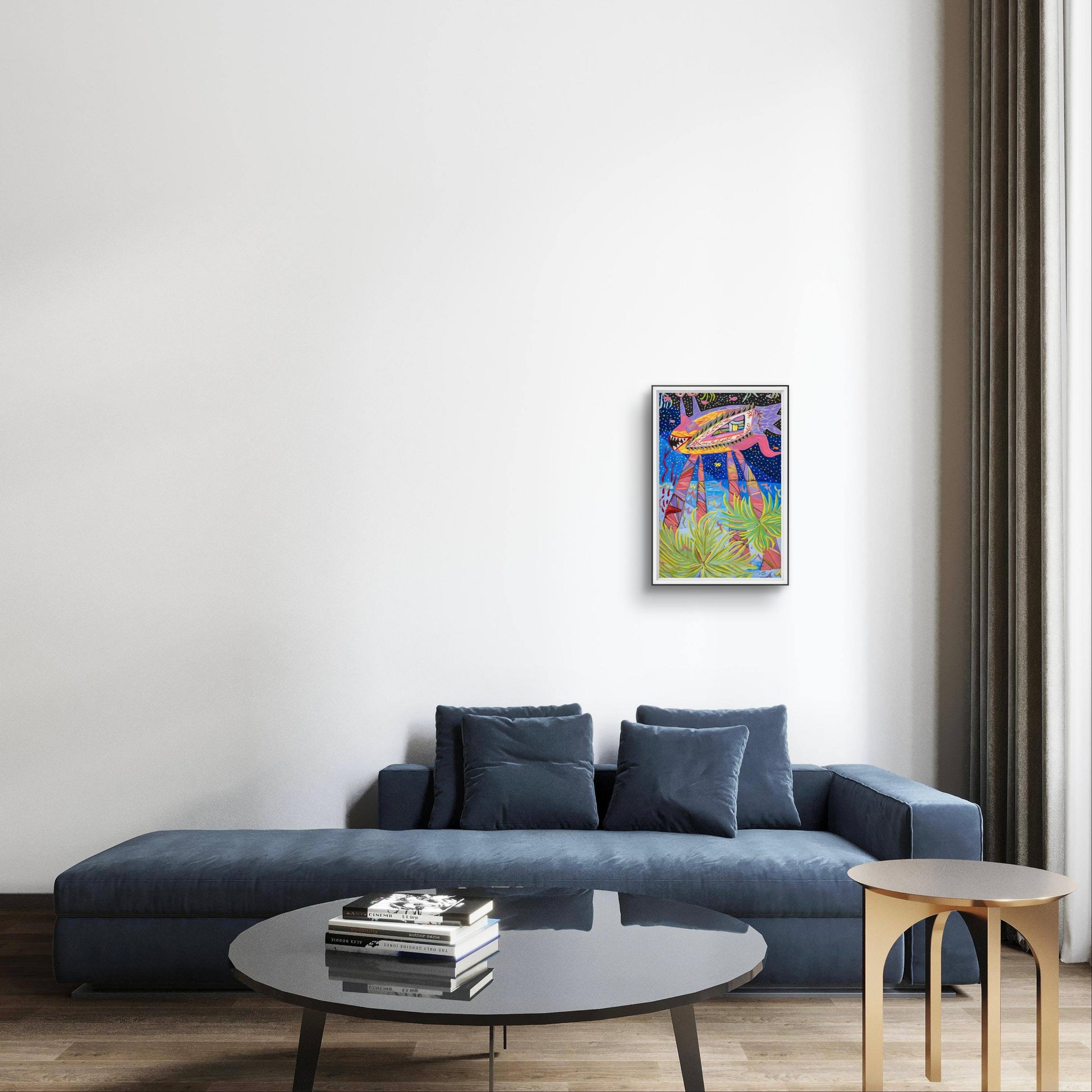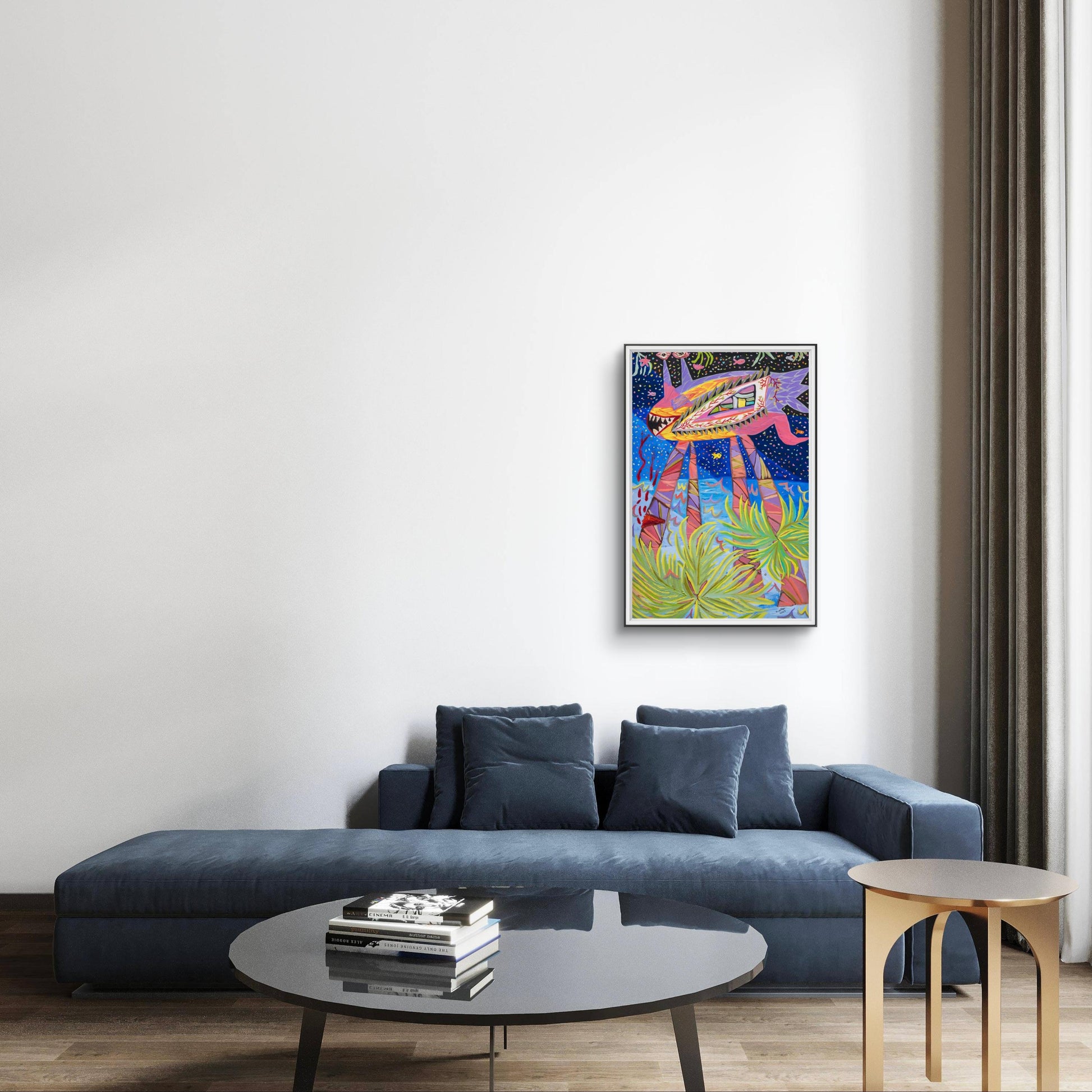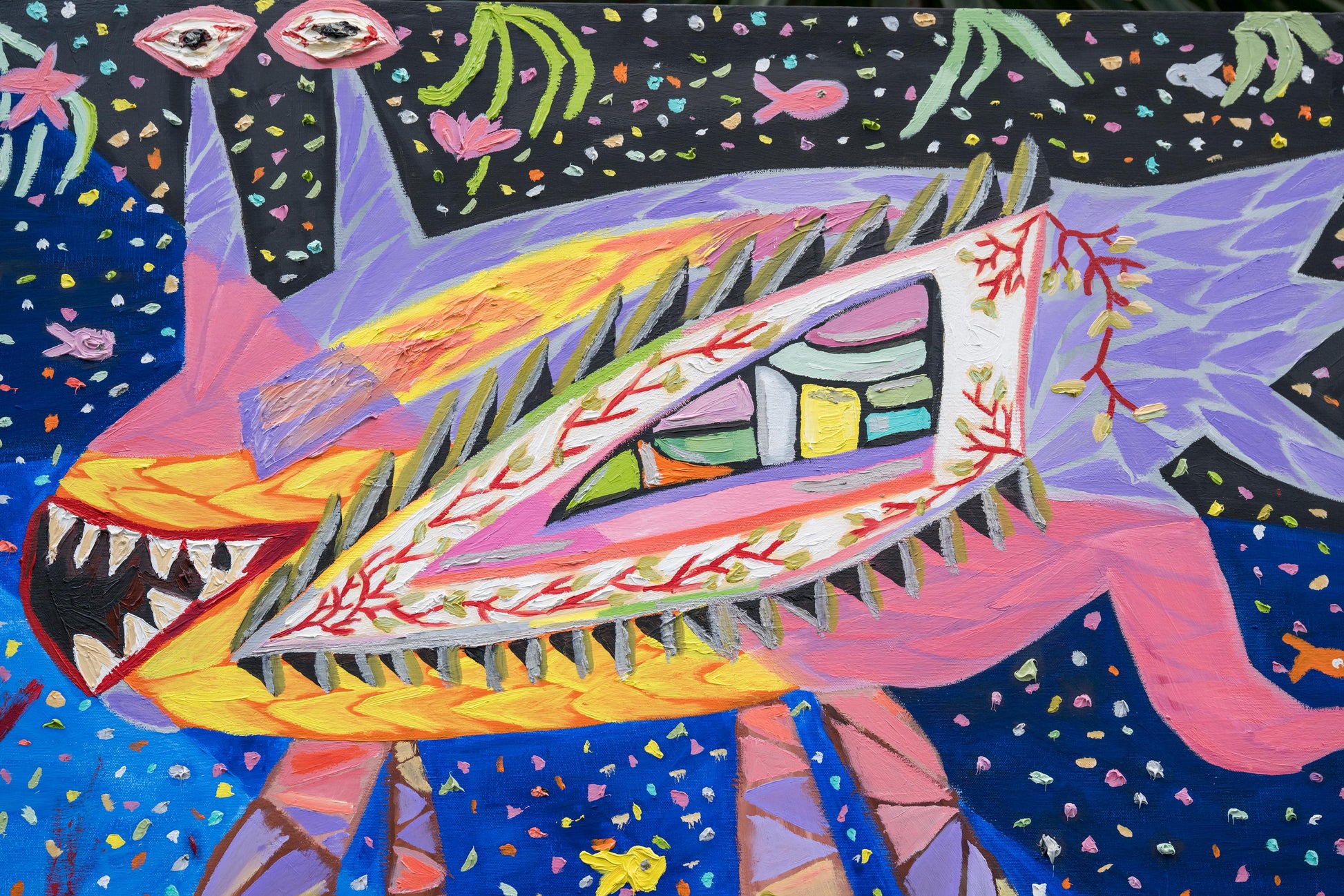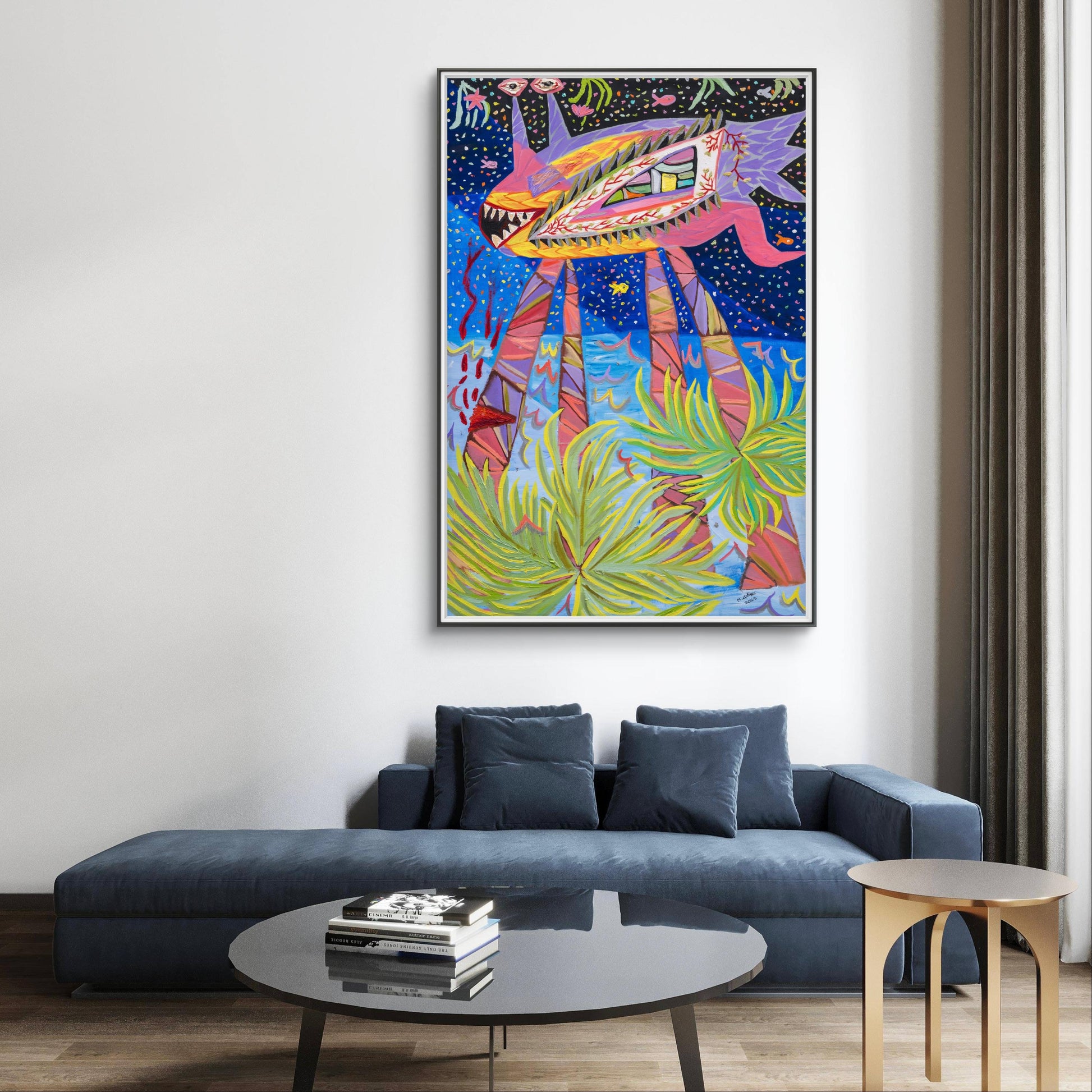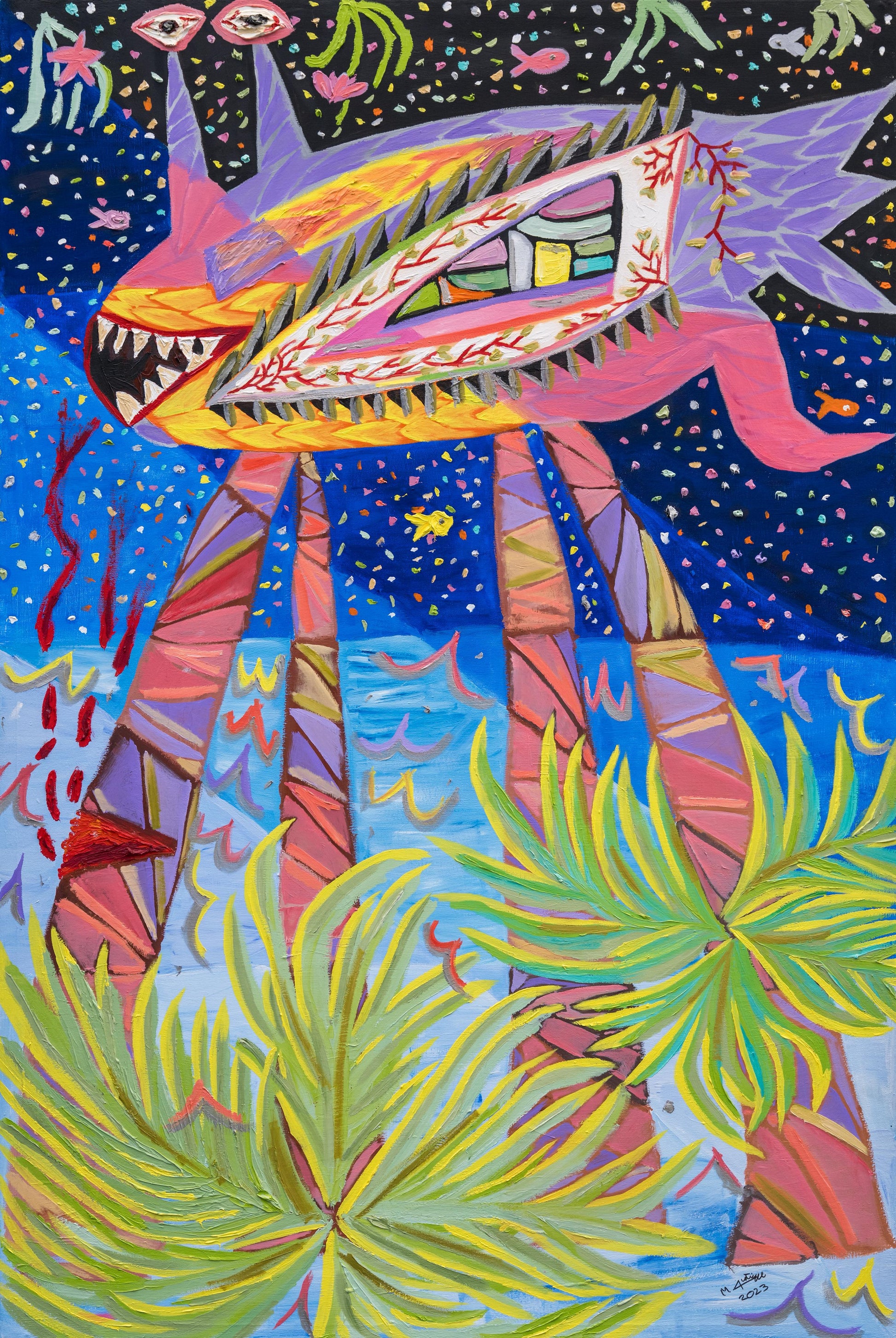 Un extraño pez de las profundidades marinas con tres ojos y patas que se transforman en palmeras. Camina alegremente mientras llora la ausencia de luz solar, bebiendo la sangre de su rodilla recién cortada. Las venas de sus ojos están echando raíces, mientras las palmeras siguen creciendo desde sus piernas.